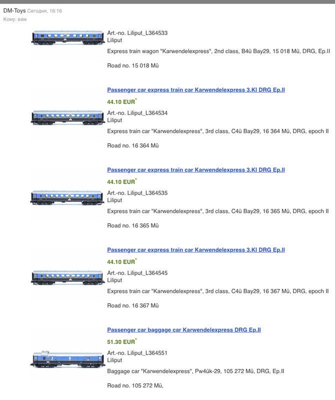 Саша, они, "Ли-путы" их еще-уже на прошлый год заявляли)) В НО было два выпуска "Карвенделов", два раза по четыре вагона, включая багажник (на всех вагонах номера разные), а еще был отдельно концевой вагон со светящимися габаритными огнями. Делая проекцию к Nам вижу, что на твоей картинке номера вагонов, соответствуют вагонам "Больших братьев", но не все. Юрка (386) мне вышлет номер вагона с габаритными огнями, тогда будет ясно, почему их в новой версии пять. Второй комплект можно поставить к первому, как сделал наш коллега 386-й, видео здесь выложено. Но, если не ошибаюсь, это второй состав, про это выкладывал накопанный материал, либо здесь, либо на старом портале.
